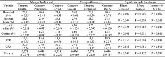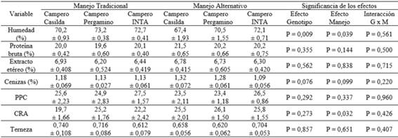 Con respecto a la composición química se observó n interacción (I) sobre el contenido de grasa (EE) de la pechuga (F=3,71; P=0,040) atribuible a un aumento del componente en las aves CC con manejo alternativo de la alimentación. En ninguno de los cortes se observaron efectos significativos del grupo genético (GG) ni del manejo de la alimentación (MA) sobre la magnitud del contenido de grasa y de proteínas. El manejo de la alimentación afectó el contenido de cenizas de las pechugas (P= 0 ,011) y la proporción de este componente fue levemente superior en ambos híbridos experimentales en el caso del corte pata-muslo (P= 0,096). En relación a los indicadores de calidad de la carne de pechuga, ninguno de los efectos analizados sobre la terneza mostró significado estadístico, si bien los híbridos experimentales de tres vías, en particular CP, mostraron una tendencia a presentar menor terneza de pechuga (mayor fuerza de corte) respecto del genotipo de referencia CI, con ambos manejos de la alimentación. Tampoco se observaron efectos significativos en la capacidad de retención de agua. En relación a las pérdidas por cocción, no se observó efecto de la interacción mientras que las pechugas de las aves sometidas a manejo alternativo de la alimentación presentaron, en promedio, valores más elevados (P= 0,004). En el caso del corte pata-muslo ninguno de los efectos analizados mostró significado estadístico ni en terneza ni en pérdida por cocción. En cuanto a la capacidad de retención de agua, no se observó efecto de la interacción ni del genotipo, pero, tal como se constató a nivel de la pechuga, se registraron valores más elevados (P= 0,032) en las aves sometidas a manejo alternativo de la alimentación.