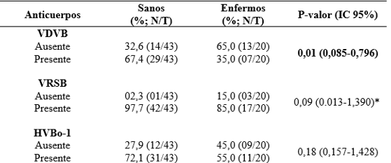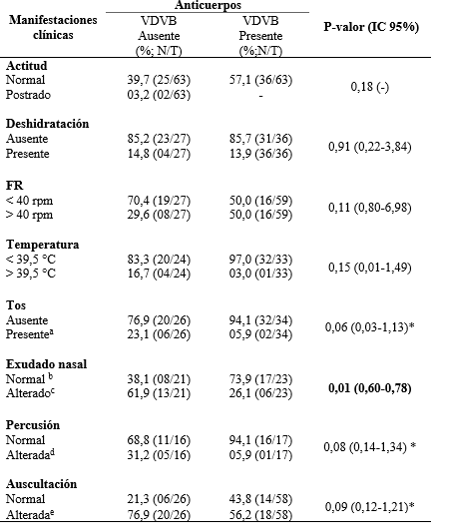 Además, se observó una asociación entre la presencia de anticuerpos contra VDVB y la presencia de bronconeumonía (P = 0,01). En cuanto a las manifestaciones clínicas (Cuadro II), se observó mayor frecuencia de anticuerpos contra VDVB en animales con exudado nasal seroso / mucoso (P = 0,01).