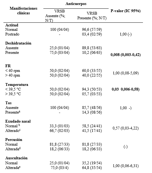 Los animales deshidratados (P = 0,008) y aquellos con una temperatura superior a 39,5º C (P = 0,03) presentaron mayor frecuencia de anticuerpos contra VRSB (Cuadro III).