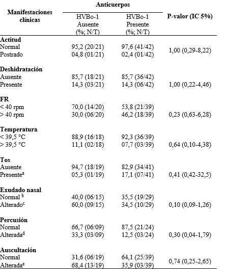 Las manifestaciones clínicas como tos y ruidos pulmonares alterados fueron numéricamente más prevalentes en animales con anticuerpos contra VRSB (Cuadro III) o HVBo-1 (Cuadro IV).