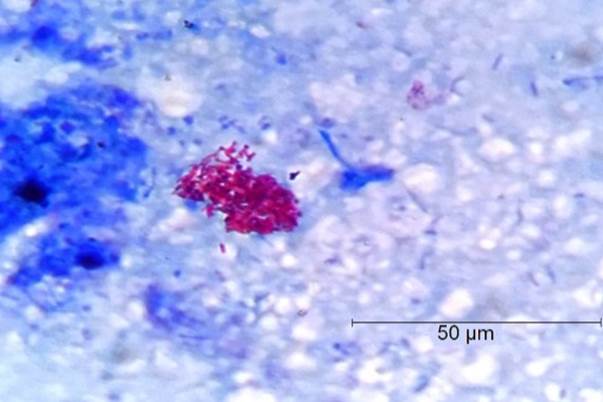 Para efectuar el aislamiento se descontaminaron 2 gramos de materia fecal por el método de la doble incubación, con cloruro de hexadecil piridinio (Sigma Aldrich®, Darmstadt, Alemania) al 0,75% y una mezcla de antibióticos compuesta por vancomicina, ácido nalidíxico y nistatina (Stabel, 1997), y luego se inoculó en medio líquido M7H9 (BD®, Sparks, USA), suplementado con yema de huevo y micobactina (Allied Monitor®, Fayette, USA) (Romero et al., 2018; Whittington et al., 2013). Estos cultivos se incubaron a 37°C y se observaron semanalmente mediante tinción de Ziehl Neelsen, durante un período de 3 meses, se consideraron positivos aquellos cultivos en los que se observaron bacilos ácido alcohol resistentes (BAAR) en forma de ovillos o nidos (Figura 1).