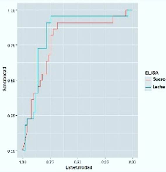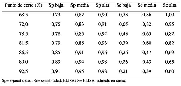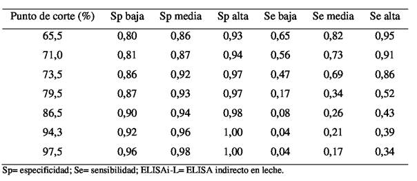 La Se fue de 91,7% (80,6-102,7%) y 87,5% (74,3-100,7%) y la Sp de 82,0% (74-90%) y 86,5% (79,4-93,6%), para los ELISAi-S y en leche respectivamente, para el suero el valor predictivo positivo (VPP) fue 0,579 y valor predictivo negativo (VPN) fue 0,973; para la leche VPP fue 0,636 y el VPN fue 0,963.