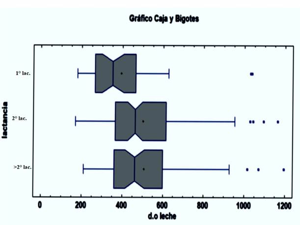 Figura 3: En el gráfico de caja y bigotes del ANOVA, las muescas representan los intervalos de confianza (IC), obsérvese que las del grupo de 1ra lactancia no están incluidas en los IC de los grupos de 2da de >2da lactancias, coincidiendo con el resultado de la prueba de LSD. 1°lac= primera lactancia; 2°lac= segunda lactancia; >2°lac= más de dos lactancias; do leche= densidad óptica en leche