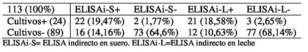 Tabla 1: Resultados de los 113 ELISAi-S, ELISAi-L y cultivos en materia fecal para la detección de Map