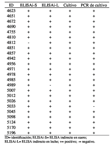 Los resultados de ambos ELISAs y cultivo en materia fecal se resumen en la tabla 1. Los 24 cultivos BAAR positivos se confirmaron a través de PCR del segmento de inserción IS900, siendo positivos a la misma 23/24, como se puede observar en la tabla 2. El cultivo al que no pudo darse identidad mediante PCR se encontraba contaminado al momento de la extracción, lo cual pudo haber resultado en una inhibición de la reacción.