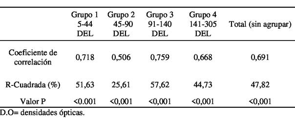 Tabla 5: Coeficientes de correlación y R-cuadrada al efectuar la correlación y regresión lineal simple entre las D.O obtenidas mediante el test de ELISA-i en suero y leche. En grupos basados en los días en lactancia