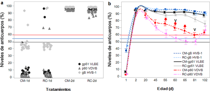 El análisis general de la media PI para el VLBE en cada evaluación mostró que todas las terneras conservaron un estatus seropositivo durante el ensayo, pero el grupo CM presentó una media superior en todas las evaluaciones después de los 45 días de edad en comparación con las medias PI del grupo RC, cuya diferencia fue más pronunciada a los 102 días de edad (fig. 1b); sin embargo, la comparación múltiple de las medias entre los grupos CM versus RC para un mismo punto de tiempo mostró que no hay diferencias significativas. Por otro lado, la diferencia entre las medias de los niveles de anticuerpos contra el VDVB y HVB-1 del grupo CM versus RC para una misma evaluación tampoco fueron significativas (tabla 4).