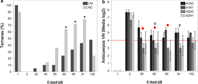 Figuras 2a y 2b: Inmunocompetencia frente al virus de la diarrea viral bovina en terneras. (2a) Proporción de terneras que alcanzan un estatus seronegativo frente al virus de la diarrea viral bovina (VDVB) cuando se alimentan con calostro materno (CM) versus reemplazador de calostro (RC) según el porcentaje de inhibición. (2b) Títulos de anticuerpos neutralizantes contra el VDVB según la prueba de virus neutralización durante el ensayo con CM intramuscular (tres aplicaciones, flechas en color rojo) y vacunación (letra V de color negro). La línea horizontal (color rojo) indica los títulos ≥ 1:16 o media log2 ≥ 4 asociados con la protección frente a la infección aguda. A1N0=grupo CM + sin aplicación de CM intramuscular; A1N1=grupo CM + aplicación de CM intramuscular; A2N0=grupo RC + sin aplicación de CM intramuscular; A2N1=grupo RC + aplicación de CM intramuscular. El asterisco indica diferencia significativa (P<0,05). La barra de error indica el error estándar de la media.