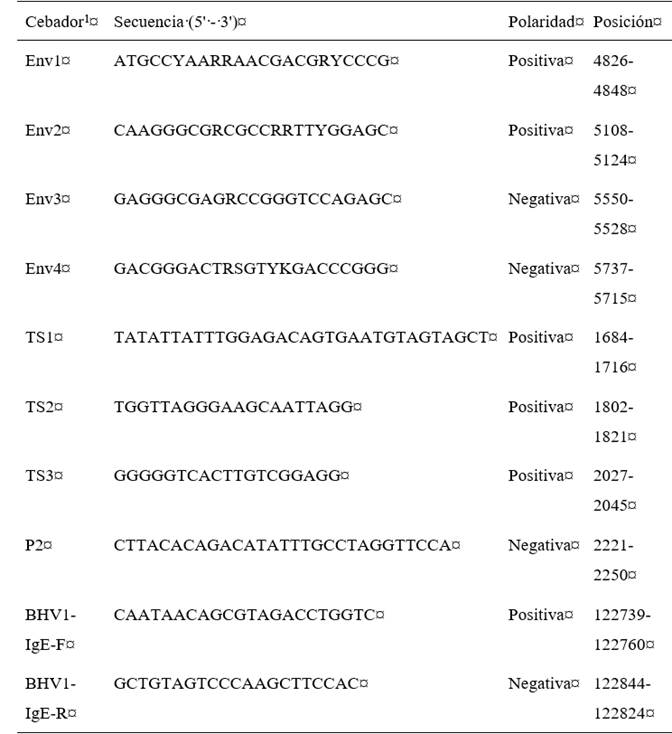 1Cebadores Env1/Env3 y Env2/Env3 amplifican la región gp51 del VLBE. Los cebadores TS1/P2, TS2/P2 y TS3/P2 amplifican la región Erns del virus de la enfermedad de las fronteras, VDVB-2 y VDVB-1, respectivamente. Mientras, los cebadores BHV1-IgE-F/BHV1-IgE-R amplifican la glicoproteína E de herpesvirus bovino 1.