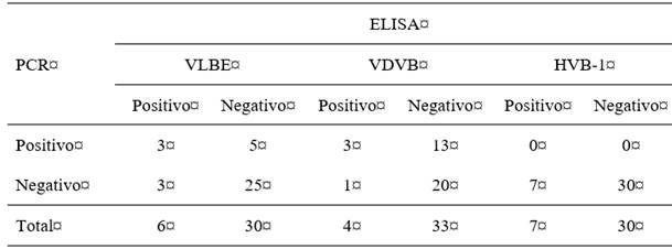 PCR=reacción en cadena de la polimerasa; ELISA=ensayo de inmunoabsorción ligado a enzimas; VLBE=virus de la leucosis bovina enzoótica; VDVB=virus de la diarrea viral bovina; HVB-1=herpesvirus bovino 1