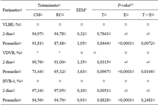 Primeramente, se evaluó el efecto del CM y RC sobre la TP y evolución de los niveles de anticuerpos desde el nacimiento hasta los 102 días de edad con base en el PI y luego se valoró el efecto del CM intramuscular desde los 55 hasta los 102 días de edad sobre la competencia inmune frente al VDVB. Los niveles de anticuerpos medidos por el PI para el VLBE, VDVB y HVB-1, así como los títulos de anticuerpos obtenidos por la PVN frente al VDVB, se analizaron utilizando el procedimiento mixto para medidas repetidas con el método de máxima verosimilitud restringida y empleando el criterio de información de Akaike corregido (AICc, Corrected Akaike Information Criteria) para elegir la mejor estructura de covarianza repetida. Los efectos fijos en el modelo fueron el tratamiento o estatus frente al VDVB, la edad y la interacción. Las terneras fueron incluidas como variable aleatoria. Los valores extremos fueron eliminados de los análisis. Las diferencias entre las medias de mínimos cuadrados de los distintos tratamientos se compararon utilizando la prueba HSD de Tukey-Kramer.