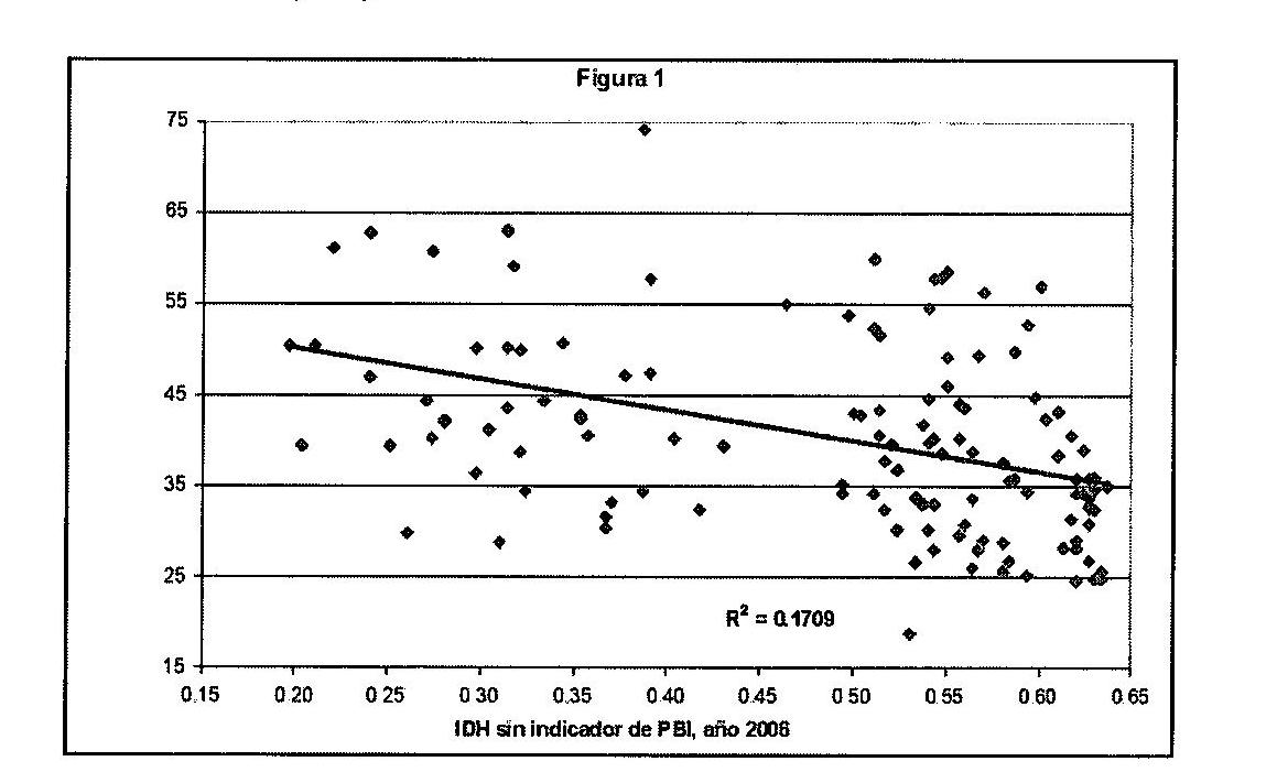 En última instancia, sostenemos que nuestra elección del indicador es acertada y que otras medidas de distribución (como Gini) están altamente correlacionadas con la dimensión distributiva del IDH. Esto último no es solo una especulación conceptual: la figura 1 muestra la relación existente entre el índice de Gini y los índices de salud y educación del IDH para un grupo de 126 países en el año 2006. De este gráfico parece desprenderse que en efecto, tomar los indicadores de salud y educación del IDH como proxies de distribución no parece desacertado, y nos permite aprovechar las ventajas ya mencionadas del IDH.