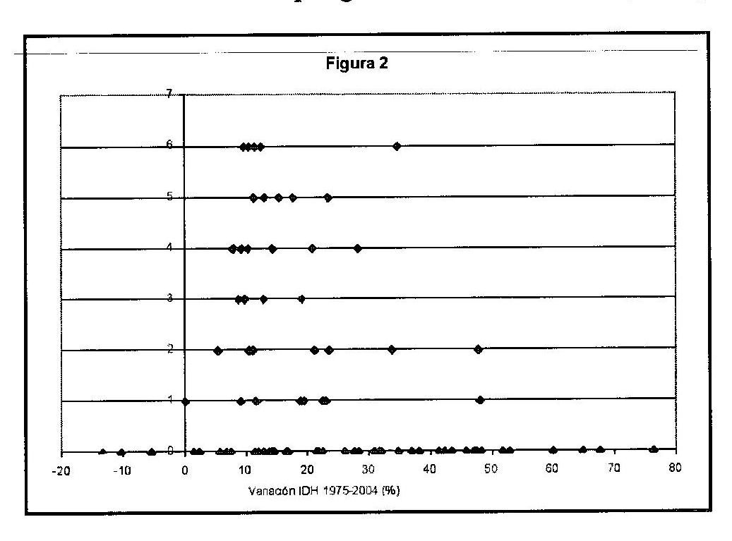 Los datos parecen sugerir que esto último no ha operado. En efecto, la figura 2 muestra que la mayor variabilidad en las tasas de cambio del IDH se ha dado en los países donde ha habido menos cambios de signo político. Los países que han cambiado más veces de signo político ven reducida la incertidumbre sobre el desarrollo, lo cual se refleja en una menor varianza de los datos a medida que aumenta el número de cambios. Esto arroja la forma piramidal que se presenta en la figura 2.