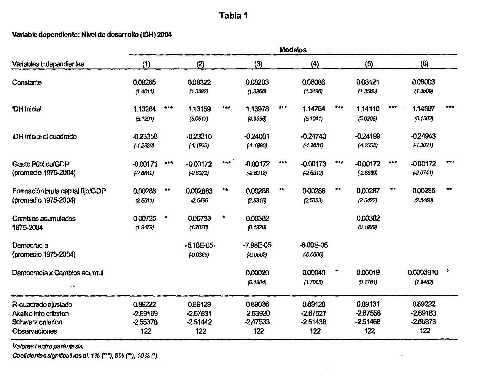 De acuerdo a nuestra hipótesis inicial, conociendo cómo un país ha transitado por diversos espectros políticos deberíamos tener algún poder de predicción sobre su nivel de desarrollo en 2004. En la tabla 1 ensayamos diferentes modelos de regresiones que tienen como variable dependiente el nivel de IDH en 2004 (ver anexo respecto a los datos y la elección metodológica).