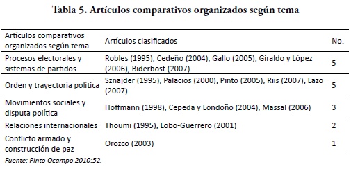 Por último, si observamos cuál ha sido el derrotero para el análisis de las publicaciones con énfasis comparativo en Colombia, puede observarse cómo esta tendencia a orientar la búsqueda con base en las clasificaciones de indexadores de las agencias nacionales de evaluación de la educación superior se reitera en el artículo de Pinto Ocampo (2010: 51), que toma en cuenta las seis revistas de temas políticos en el clasificador de Colciencias[9]. Sin embargo, la autora elige además un segundo criterio de carácter exhaustivo, que radica en analizar un total de 175 revistas colombianas, aunque sin definir el criterio de búsqueda, relevancia o cientificidad de las mismas. En un estudio de características exploratorias, José Puello-Socarras y Juan Bautista Lucca (2011) al analizar qué se publica en política comparada en Colombia, establecen como criterio la pertenencia disciplinar o politológica, seleccionando de esta forma tres revistas: Colombia Internacional (Universidad de Los Andes), Análisis Político (Universidad Nacional de Colombia) y Papel Político (Universidad Javeriana).
