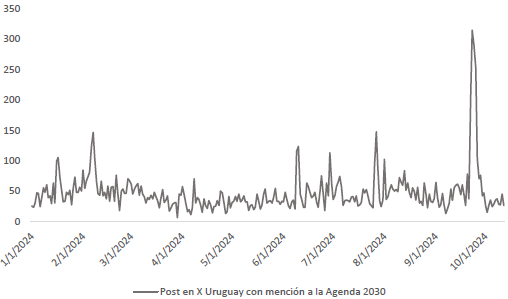 Para este trabajo se extrajeron desde Meltwater7, una plataforma de monitoreo de redes sociales y medios digitales, las menciones a la «Agenda 2030» posteadas desde X durante el 2024, desde el 1 de enero hasta el 12 de octubre. Se obtuvieron 13.037 menciones8 impulsadas por 2.066 usuarios geolocalizados en Uruguay9. Para el análisis se procesaron el volumen diario de contenidos y la repetición de temas, las biografías de usuarios y agrupadamente se trabajó con las menciones en la plataforma.