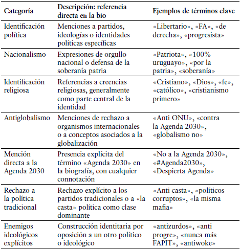 La clasificación y agrupamiento de usuarios se realizó con base en las biografías de la plataforma o biopic10, en este sentido solamente se tuvieron en cuenta aquellas biografías descriptivas de la identidad y preferencias políticas de los usuarios. Se consideraron únicamente las que ofrecieran información relevante sobre la identidad política, ideológica o valorativa del usuario. En función del contenido textual, se construyeron las siguientes categorías analíticas presentes en la Tabla 1.