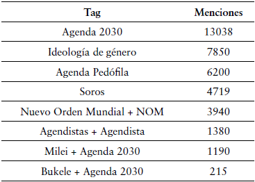 En la Tabla 2 se enumeran las repeticiones de conceptos en la conversación sobre las principales preocupaciones o amenazas que identifica esta comunidad. Se observan casi 8 mil menciones a la «ideología de género» identificando así este término polémico como el nexo principal con el concepto de agenda que esta comunidad asume como amenazante, así como objeto de rechazo en su militancia digital. Las narrativas habituales de rechazo a las cuestiones de género y sexualidad la consideran una agenda que pretende destruir sus valores tradicionales en torno a los arreglos familiares y crianza de los niños. Las menciones de «agenda pedófila» que aparecen en cuarto lugar también se vinculan con estas creencias.