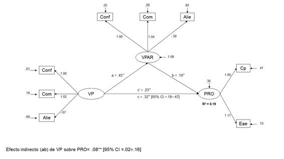 Considerando el ajuste adecuado del modelo hipotetizado, se calcularon los efectos directos e indirectos (figura 1). En primer lugar, se observa que el VP está significativamente relacionado con VPAR (a = 0.45, p < .01). En segundo lugar, el VPAR está significativamente relacionado con la PRO, después de controlar el VP (b = 0.19, p < .01). En tercer lugar, el VP está asociado de manera significativa e indirecta con PRO a través de VPAR (ab = 0,08, 95% CI (0.02 ÷ 0.16)). Debido a que el efecto directo de VP sobre PRO fue significativo (c’= 0.23, p > .01), se concluye un papel mediador parcial del vínculo de pares en la relación entre vínculo parental y comportamiento prosocial, observándose una explicación del 25% de la relación (ver figura 1). Al respecto, se infiere que cuando interviene el vínculo de pares se observa un mayor efecto del vínculo parental sobre el comportamiento prosocial. Por lo tanto, el vínculo de pares constituye un mecanismo psicológico que contribuye al desarrollo del comportamiento prosocial.