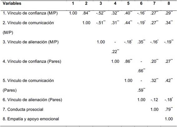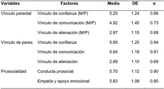 En la tabla 1, se muestra que para el caso del vínculo parental las puntuaciones medias más altas corresponden al vínculo de confianza (M = 5.25), tendencia que también se observa en el caso del vínculo de pares (M = 5.85). Por otro lado, las puntuaciones medias más bajas se observan en el vínculo de alienación, tanto para el vínculo parental (M = 2.97) como para el vínculo de pares (M = 2.89). Los resultados muestran una tendencia favorable hacia los vínculos parental y de pares. Respecto de la prosocialidad, las puntuaciones medias más altas se observan en el factor de empatía y apoyo emocional (M = 5.83) seguido de conducta prosocial (M = 5.70), lo que indica una tendencia favorable hacia la prosocialidad. Finalmente, se muestra que las puntuaciones observadas presentan niveles adecuados de desviación estándar y consistencia interna, ya que los valores se sitúan dentro de los límites recomendados.
