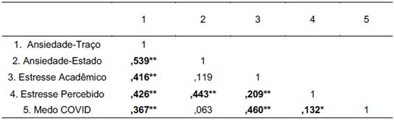 A investigação das correlações entre as variáveis (Tabela 3) foram apresentadas associações entre os indicativos de mal-estar psicológico em docentes universitários, em que o medo de Covid-19 se correlacionou positivamente com a ansiedade-traço e o estresse acadêmico. Os resultados corroboram com os achados de Wang et al. (2020), que indica a presença de ansiedade e estresse em tempos de pandemia. Considera-se esse um achado importante deste estudo, ainda que não seja possível inferir causalidade entre as variáveis a partir da análise de correlação.