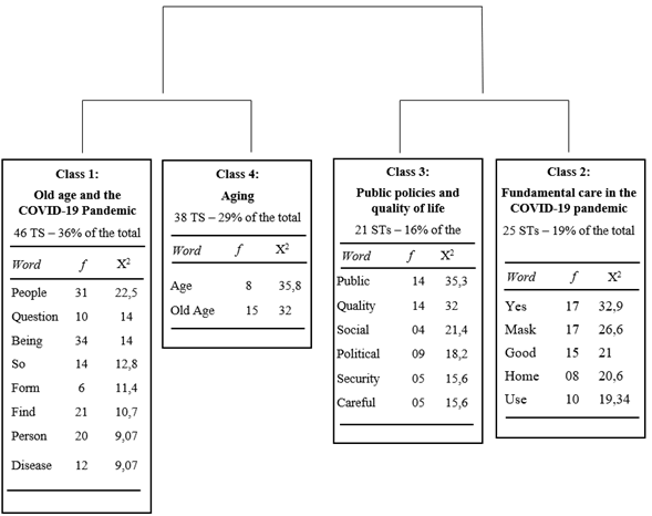 The data obtained in the semi-structured interview were grouped in a database that comprises a textual corpus composed of 21 texts, i.e., interviews. After data analysis, the information was grouped into 146 text segments (TS) that make up 4 different word classes: Class 1: 46 ST (35.38%), Class 2: 38 ST (29.23%), Class 3: 21 ST (16.15%) and Class 4: 25 ST (19.23%). The dendrogram that represents the data related to the formation and structuring of each indicated class will be shown below using an illustrative figure 1, taking into account the order of division of the classes in their subcorpus, the frequency of the words (F), as well as the X². After the word classes are presented, they will be discussed.