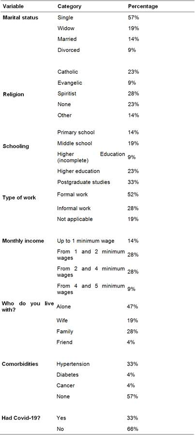 Although the researchers did not intentionally demarcate the participants' natural state most of the population participating in the study lived in São Paulo (42.9%) and Rio de Janeiro (28.6%), while the states of Paraná, Pará, Ceará and Maranhão had the lowest participant population, with 4.8% of the average. This is an interesting fact, considering the level of inequality present in Brazil and, consequently, its interaction with aging. The Brazilian northeast region, for example, has one of the lowest human development and urbanization rates in the country, which, combined with other factors, reduces the life expectancy of residents (Freitas et al., 2022). It is also important to highlight that all participants were cisgender, a finding that can be contextualized by the low life expectancy of transgender people in Brazil, which is under 40 years. Consequently, the presence of older transgender people in the country is extremely limited (Bezerra et al., 2025). Also, among the study's collaborators, it is worth noting that 6.9% lost people to COVID-19. Below are the sociodemographic data of the participants (table 1):