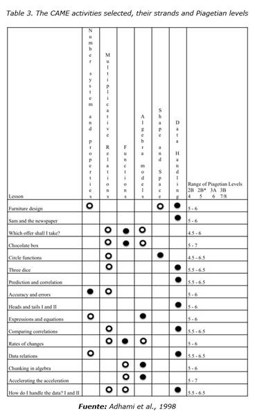 Table 3 shows the name of the activities selected, the main strand of focus (black circle), the secondary strands of focus (white circle) and the range of Piagetian levels covered by each.