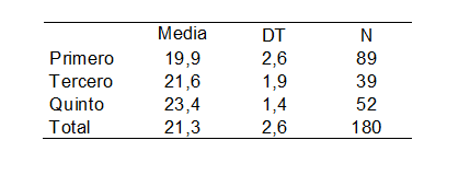 Evaluación: Los resultados señalan F(2,179)=9,993, P<0,001. El análisis post hoc indica diferencias significativas entre los promedios del grupo 1 (M=21,4831) en relación con los del grupo 3 (M=22,7692) y 5 (M=23,0962). Es decir, los estudiantes de primer año tienen, en promedio, un puntaje menor, y con diferencias estadísticamente significativas, que los estudiantes de tercer y quinto año; entre estos dos últimos grupos no se observan diferencias. En el marco del rango de puntajes posibles, todos los grupos se ubican en el segundo tercio.