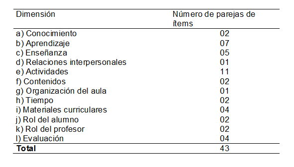 Los 43 ítems asociados a una propuesta tradicional y los 43 relacionados con una propuesta constructivista conforman parejas de ítems ligadas a cada dimensión (43 parejas de ítems en total). En la tabla n.º 2 se incluye la cantidad de parejas de ítems por dimensión: