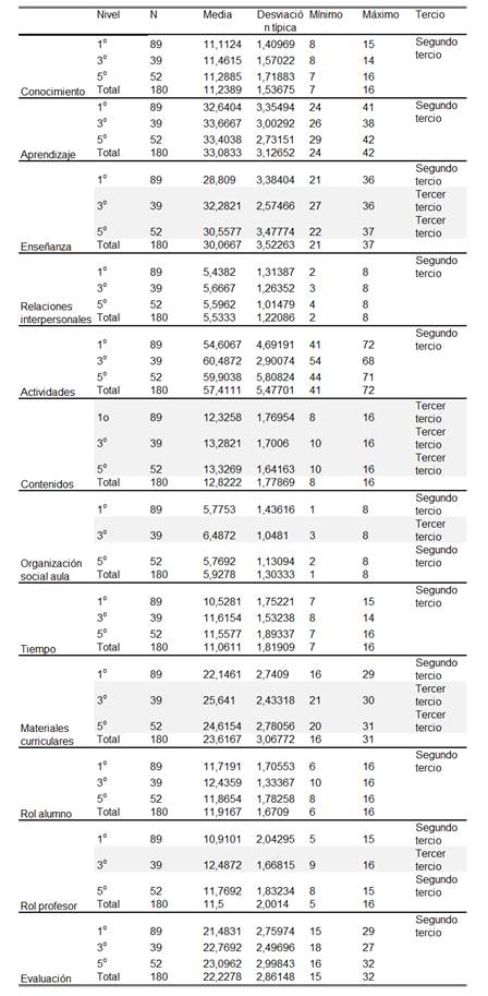 Se implementó un diseño descriptivo-comparativo (ver León y Montero, 2002), que comparó los puntajes promedios de cada nivel (primer, tercer y quinto año) en relación con cada una de las dimensiones del instrumento. Se procedió a explorar cada una de estas dimensiones (doce en total) como un rango de puntajes que oscila entre el puntaje menor, que implica una tendencia a estar de acuerdo con una propuesta tradicional de enseñanza-aprendizaje, y un puntaje mayor, que implica la tendencia a estar de acuerdo con una propuesta constructivista de enseñanza-aprendizaje. Este rango de puntajes se obtuvo con base en la suma de cada uno de los ítems que componen el instrumento, previa inversión de los ítems correspondientes.