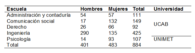 La escala se aplicó a una muestra de estudiantes universitarios de la UCAB, de 2° y 4° año, y los semestres análogos, entre marzo y abril del 2012. También se incluyó una pequeña muestra de alumnos de la Universidad Metropolitana (UNIMET, Caracas). El total de 906 cuestionarios se distribuyeron, de acuerdo a la carrera y al sexo, como se indica en la tabla n.º 1. Fueron eliminados 22 cuestionarios porque no indicaban el sexo del alumno.