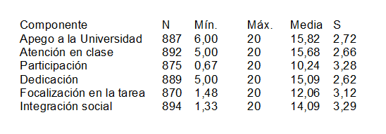 Por el significado de los ítems agrupados, el primer factor se denominó apego a la universidad (18,16 % de la varianza explicada); el segundo, atención en clase (6,14 %); el tercero, participación activa (5,07 %); el cuarto, dedicación (4,03 %); el quinto, focalización en la tarea (3,40 %) y el sexto, integración social (3 %).