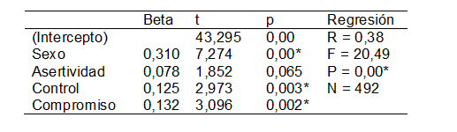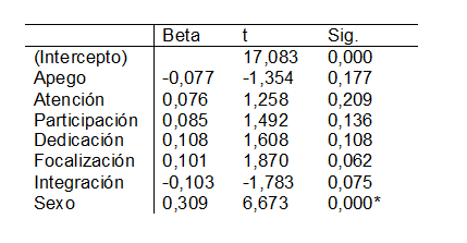 Como se puede observar en la tabla n.º 4, entre 460 estudiantes, el modelo explica significativamente el 15 % de la varianza total de la variable predicha (R = 0,393, R2 = 0,154, F = 11,8, p = 0,00). En particular, el sexo predice significativamente al rendimiento académico, donde las mujeres presentan mayor rendimiento que los hombres (β= 0,31, p= 0,00). Ninguna dimensión del IA predice el rendimiento académico reportado por los estudiantes.