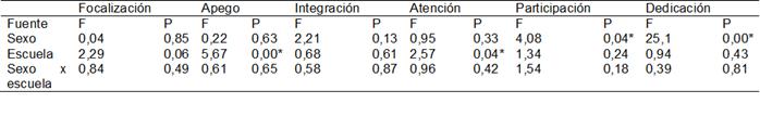 Tabla N.º 5: ANOVA de las dimensiones del IA (ACP 1) en función del sexo y escuela (2 x 5) para todas las dimensiones *Significativo al 0,01 Fuente: Elaboración propia de los autores (2016)