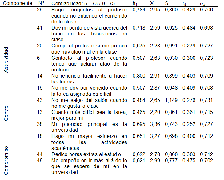 Además, la presente investigación halló que el instrumento permitió establecer, a través del uso de doce reactivos, lo que la literatura denomina como personalidad resistente o hardiness académico (Kobasa, 1979). El análisis de confiabilidad arrojó una adecuada consistencia interna de esta subescala y se encontró una estructura factorial cónsona con la conceptualización establecida por Kobasa et al. (1982) sobre el hardiness académico: compromiso, control y asertividad.