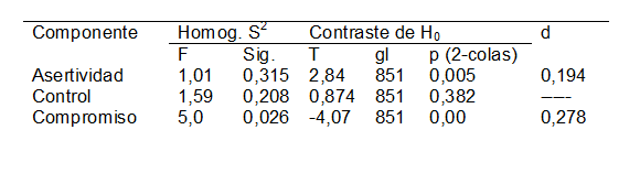 Por último, se evaluaron las diferencias en las dimensiones de hardiness académico por sexo mediante una prueba t de Student para muestras independientes (ver tabla n.º 8). Hubo diferencias por sexo en las dimensiones asertividad y compromiso, de manera que las mujeres manifestaron mayor asertividad (mujeres = 1,00 y hombres = 0,98) y los hombres reportaron mayor compromiso (hombres = 1,07 y mujeres = 0,93).
