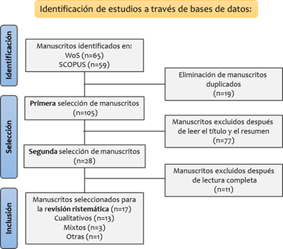 Luego se realizó una lectura completa de los documentos (28) y se encontraron falsos positivos (11), es decir, manuscritos recuperados pero que no son pertinentes para el estudio en particular (Codina, 2018). Finalmente, tras completar todos los criterios establecidos se obtuvieron 17 manuscritos para realizar la revisión sistemática.