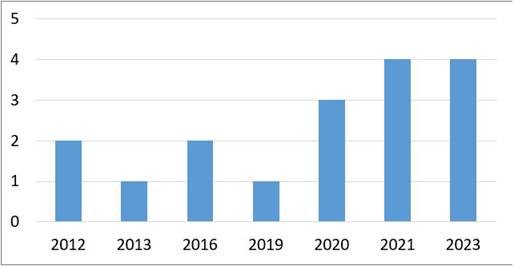 Los manuscritos analizados se publicaron entre 2012 y 2023, aunque para la búsqueda inicial se abarcó de 2007 a 2023. Más del 50% de las publicaciones se concentran entre 2020 y 2023, lo que evidencia un creciente interés en la temática (ver Figura 2). Respecto de los diseños metodológicos, se identificaron 13 estudios cualitativos (76,5%), tres mixtos (17,6%) y uno descriptivo (5,9%). Las técnicas incluyeron registros de campo, observaciones, entrevistas, registros fotográficos y/o audiovisuales, cuestionarios, entre otros.