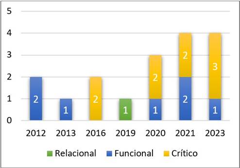 El análisis de las perspectivas de la interculturalidad en los estudios reveló una transición. Se observa un movimiento de una perspectiva predominantemente funcional hacia una mayor incorporación de las perspectivas críticas en las investigaciones recientes, como se ilustra en la Figura 3. Este cambio podría reflejar una respuesta a las demandas de contextos educativos cada vez más diversos y atingentes a las realidades de cada país. Destaca la necesidad de explorar nuevas formas de integración cultural en la enseñanza de las matemáticas. No obstante, las perspectivas coexisten y contribuyen al campo, lo que sugiere una falta de consenso en la comunidad científica al estudiar la interculturalidad.
