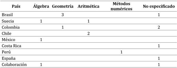 El análisis de los manuscritos reveló un enfoque en situaciones y las demandas sociales de los sujetos. Es decir, se priorizó cómo se conceptualizaron y apoyaron las experiencias educativas de los estudiantes o profesores en contextos interculturales más que los objetos matemáticos. Esta intención subyacente de los autores pudo deberse a la necesidad de comprender la diversidad cultural y su impacto en los procesos educativos, por encima de los contenidos disciplinares. Aunque estos últimos no fueron ignorados, complementaron y enriquecieron las prácticas de las investigaciones, evidenciando la riqueza del campo. Las áreas matemáticas abordadas fueron variadas, tal como se muestra en la Tabla 1, que distribuye los artículos por país de publicación y áreas matemáticas, para visualizar así las tendencias temáticas y geográficas.