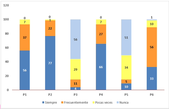 Finalmente, 56 % y 51 % evidencia que nunca o pocas veces algunos estudiantes impiden que otros compañeros se unan al grupo de trabajo, haciéndolos sentir inferiores (P3) o que excluyan o discriminen a sus compañeros porque se consideran estudiantes superiores o más "populares" (P5). Como sostienen Benítez Moreno et al. (2024), la autoestima ocupa un lugar fundamental dentro de la construcción de la convivencia escolar, cuya vulneración incrementa la desprotección frente a la violencia e interfiere en la progresión de competencias socioemocionales. Los docentes, en su práctica profesional, deben fomentar la empatía como valor transversal.