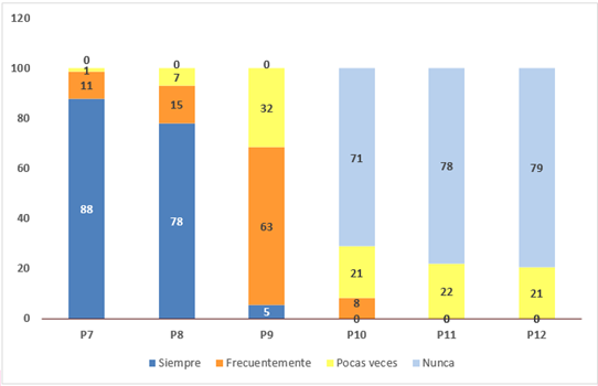 En esta segunda dimensión, los resultados muestran el fácil acceso que tienen los estudiantes a estos medios tecnológicos que facilitan la agresión. Según la Figura 2, el 88 % y el 78 % de los participantes indican que siempre algunos estudiantes atacan, insultan o amenazan a otros mediante mensajes de texto en WhatsApp, correos electrónicos y redes sociales (P7) y comparten o publican fotos o videos ofensivos de sus compañeros con la finalidad de ridiculizarlos (P8). Sin embargo, para estas malas acciones, comentar esas fotos y videos subidas con el objetivo de avergonzarlos o dañar su reputación (P9), el 32 % afirman que pocas veces lo realizan para este fin. Los resultados son consonantes con lo que Bello-Villablanca y López-Yáñez (2022) denominan el mal uso de las TIC, en el sentido que los entornos digitales que carecen de mediación adulta o docente tienden a convertirse en ambientes de agresión/exclusión por oposición a un espacio para el aprendizaje colaborativo