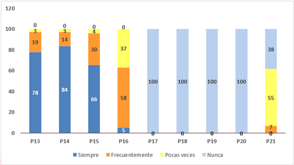 Ahora bien, el 100 % de los estudiantes señala que nunca los profesores les han enseñado a gestionar su enojo ni a evitar la violencia como método para resolver conflictos de manera pacífica (P17). Además, la escuela no lleva a cabo talleres con los familiares para prevenir situaciones de violencia en redes sociales (P18). Tampoco existen espacios para que los estudiantes puedan discutir los conflictos entre compañeros y llegar a acuerdos para resolverlos (P19); y los estudiantes no han realizado actividades en la escuela para reducir la violencia y mejorar la convivencia en el aula (P20). Como exponen Criollo et al. (2024), esta falta muestra que la formación para la no violencia queda prácticamente en las manos de la acción individual de los propios docentes, desprovista de un plan institucional sostenido en una cultura de paz.