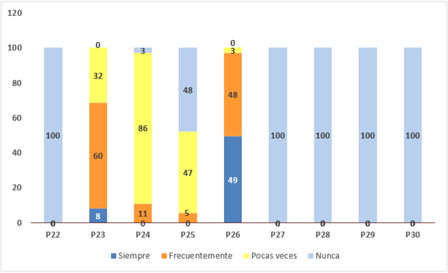 En contraposición de los resultados mostrados, el 60 % del estudiantado asegura que frecuentemente en las clases se recuerdan las normas de convivencia para evitar la violencia entre estudiantes (P23); Sin embargo, el 86 % indica que son pocas las veces que los docentes ayudan e intervienen para resolver un conflicto (P24). El 47 % y 48 % aseguran que pocas veces o nunca se aplican sanciones a los estudiantes que maltratan, discriminan o son violentos con otros (P25). Por último, el 49 % y 48 % indican que siempre o frecuentemente, cuando un estudiante acosa o violenta a otro, los padres son citados por los docentes (P26).