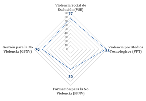 Finalmente, se hace un análisis general de los hallazgos significativos (Figura 5), donde se deduce que las mayores afectaciones corresponden a la violencia mediante medios tecnológicos (88 %) y la violencia social de exclusión (77 %), lo que ilustra que el uso que hacen los estudiantes de las redes sociales se traduce en un espacio de reproducción de prácticas de ciberacoso y violencia por exclusión social entre pares. En contraposición, la formación para la no violencia (50 %) y la gestión institucional (70 %) alcanzan niveles intermedios, lo que lleva a establecer que, aunque sí existe un esfuerzo por parte del profesorado para la reflexión y el diálogo, la escasa existencia de un programa de convivencia digital en entornos de aprendizaje, de talleres de emprendimiento frente al ciberacoso y la poca o nula participación de las familias suponen un acto limitado de la acción docente. Esta distribución confirma que la convivencia escolar en la virtualidad es una convivencia asimétrica; las dimensiones de la violencia y de la exclusión forman una amplia distancia con los resultados de las dimensiones que deberían compensarla.