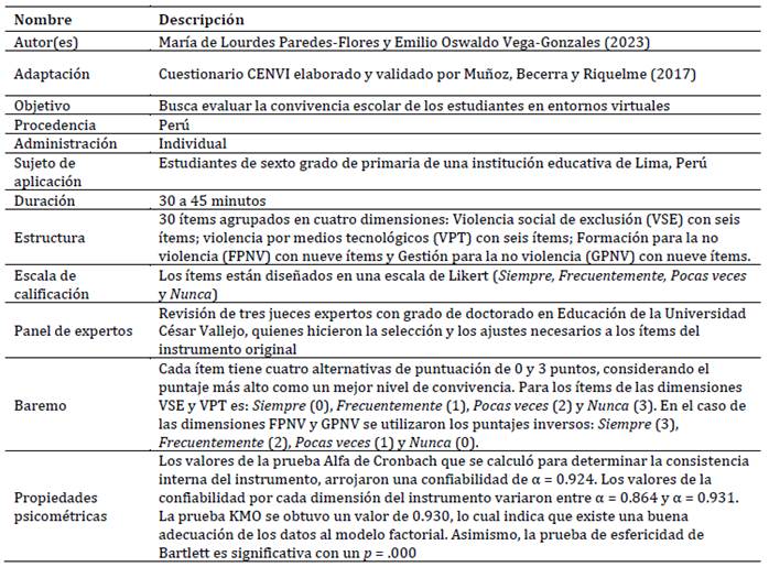 Esta información fue validada mediante un formato de consentimiento informado otorgado por la institución educativa. Es importante mencionar que los instrumentos presentados se encuentran adaptados al ámbito educativo virtual y están pensados para ser aplicados a los estudiantes con el fin de obtener información respecto a la percepción de convivencia escolar en el entorno virtual. En la Tabla 1 se presenta la ficha técnica del cuestionario utilizado.
