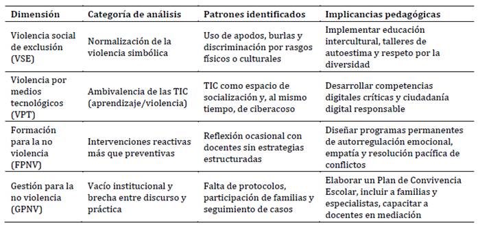 A modo de resumen, la identificación de las categorías basadas en el análisis de los resultados permitió categorizar no solo las conductas observadas en los estudiantes, sino que también revelar tensiones estructurales en la convivencia escolar virtual en las cuatro dimensiones de la variable de estudio, las cuales funcionan como ejes que integran las categorías emergentes, los patrones recurrentes y sus implicancias pedagógicas. En la Tabla 2 se muestra la articulación entre las dimensiones y las categorías, que ofrecen insumos claves para comprender el problema desde una mirada integral, que combine diagnóstico y propuestas de intervención pedagógica.