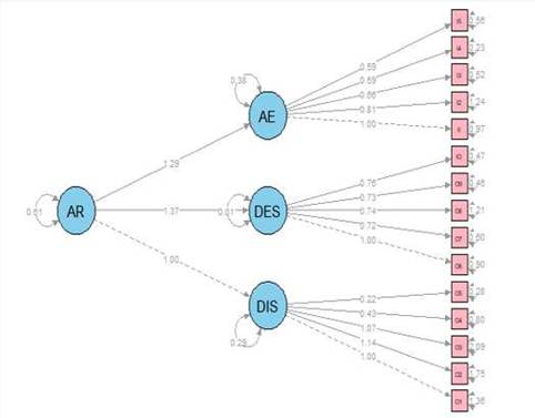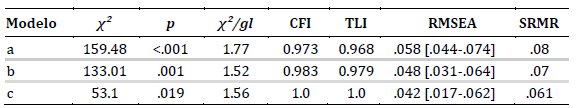 Los indicadores de ajuste de los tres modelos puestos a consideración son de muy buenos a excelentes (Tabla 4). En la Figura 1 se presenta el modelo b: un modelo factorial de segundo orden con tres factores de primer orden.