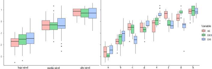 El análisis utilizando métodos gráficos y cuantitativos, así como los antecedentes, sugiere k = 3 y k = 8 como el número de conglomerados con mayor coeficiente de silueta y menor WSS. Como puede observarse en la Figura 2 y en la Tabla 6, k = 3 capta de manera general el nivel de puntuación en autorregulación docente; pueden interpretarse, por lo tanto, como conglomerados de bajo, medio y alto nivel. Los perfiles identificados con k = 8, por otro lado, permiten observar la diversidad de perfiles internos a cada uno de estos niveles. Por ejemplo, aunque en los conglomerados e y f la mayor parte de los sujetos se encuentran en el conglomerado de medio nivel (71 % y 60 %, respectivamente), sus puntuaciones en las sub-escalas son cuasi simétricas: mientras el conglomerado e muestra puntuaciones mayores en DIS y menores en AE, el conglomerado f muestra puntuaciones mayores en AE y menores en DIS.